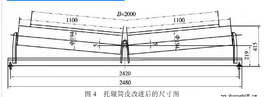 改进措施:由于运输皮带与托辊摩擦只集中在中部,两侧很少用到,因此再次定制托辊时,辊轴尺寸不变,筒皮总长缩短10mm,在维修更换托辊时,如发现已经磨损,热浸锌层遭到破坏的托辊支架,用纱布打磨后喷干式锌粉自喷锌漆,以减少锈蚀,为防止橡胶皮带的撕裂,对于磨损严重的托辊支架予以更换,消除隐患;